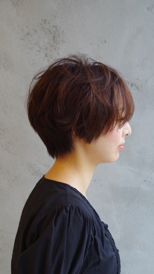 耳隠れるぐらいで、襟をスッキリ切ると、女性らしさも残るし、長い前髪が、セクシーな感じも表現します。