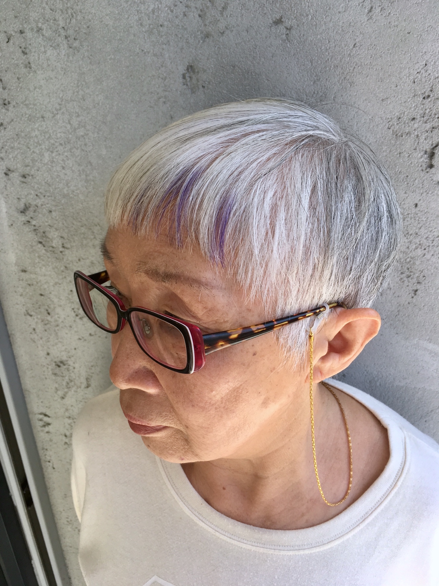 今回はマッシュルームベースのショートカットに淡紫のポイントハイライトが入っとります。