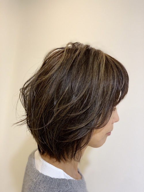 根元は白髪染めでしっかりと染めつつ、ハイライトでよりオシャレで立体的なカラーに仕上げました(^○^)