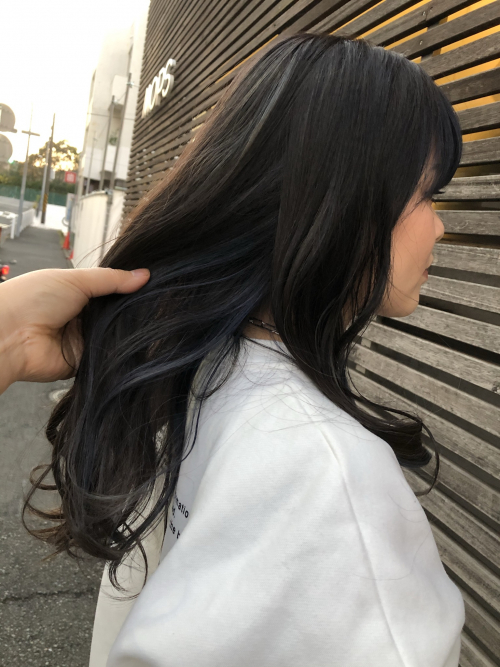 全体に細くケアブリーチでハイライトを!元々明るく褪色していたフェイスブレイミングカラーの名残りも生かしながら濃いめのネイビーをオン‼︎‼︎